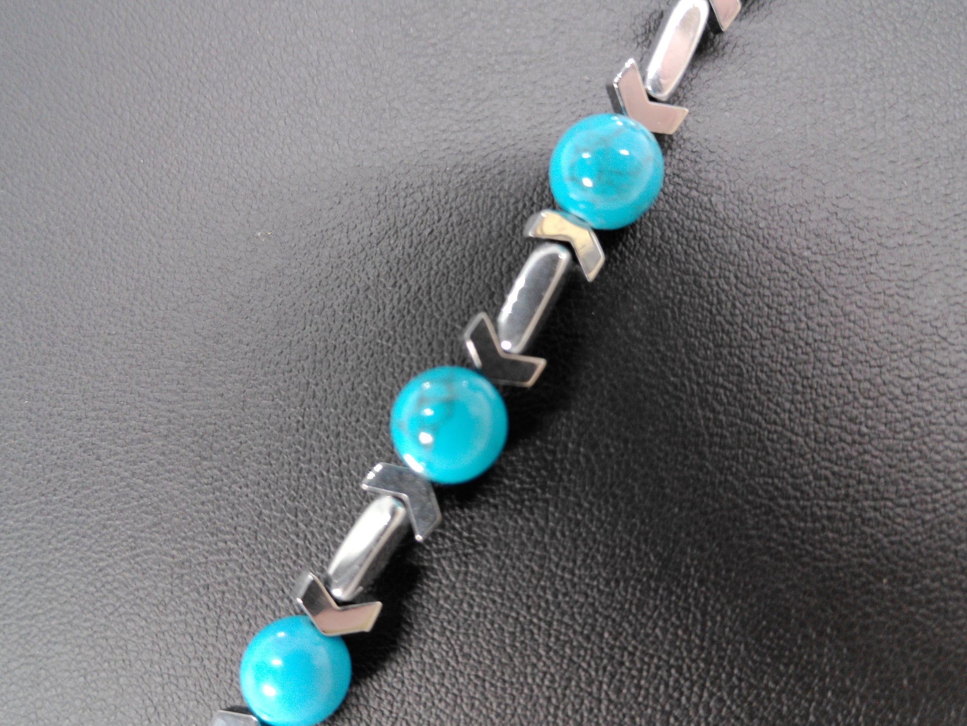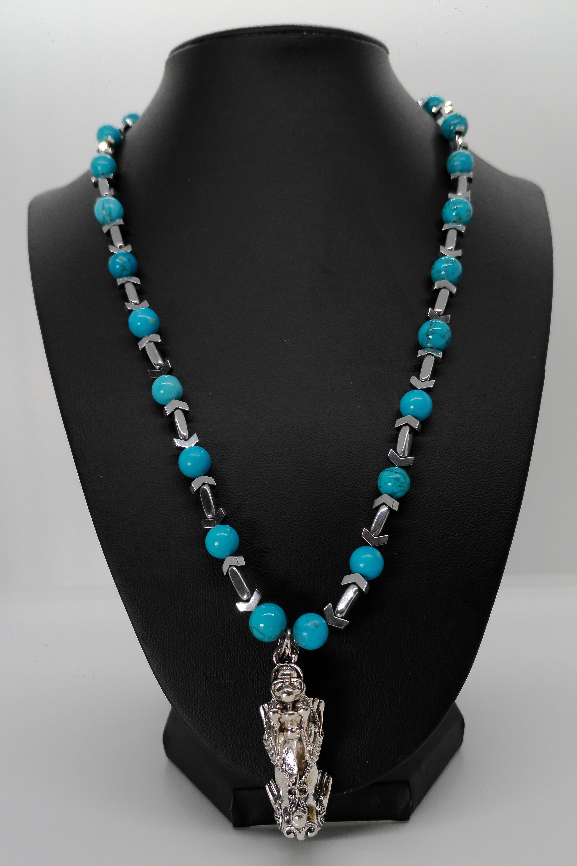 Stunning acrylic turquoise and silver-tone modern beads with a gorgeous, intricately carved 2-inch dragon drop. 22-inches.