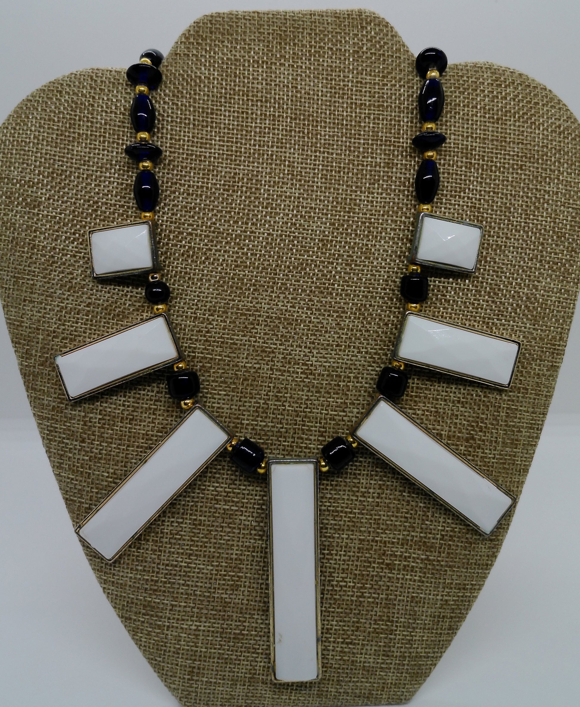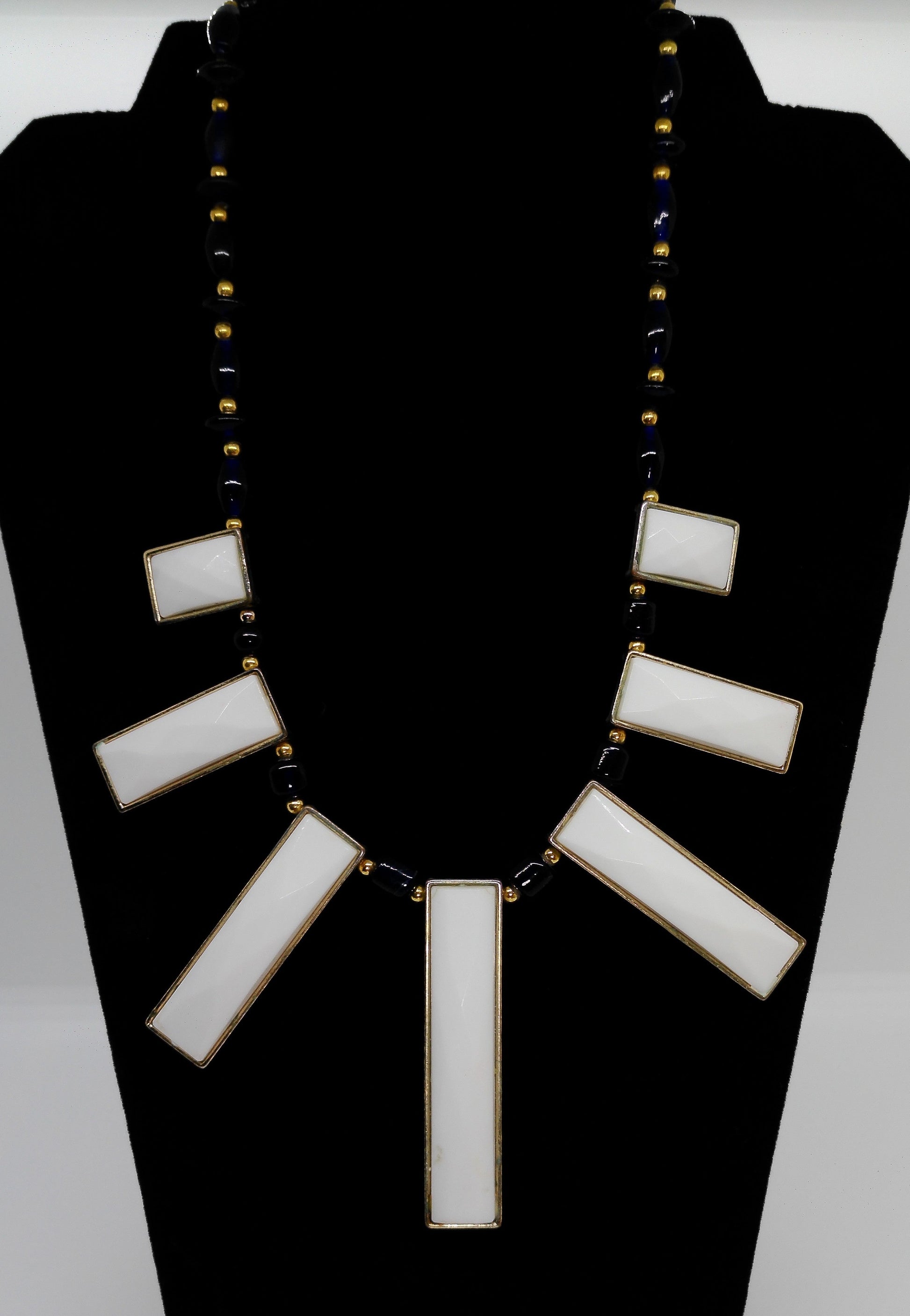 Assorted-shaped dark blue glass with graduated rectangular cushion-cut white glass and gold-toned accents. 21-inches.