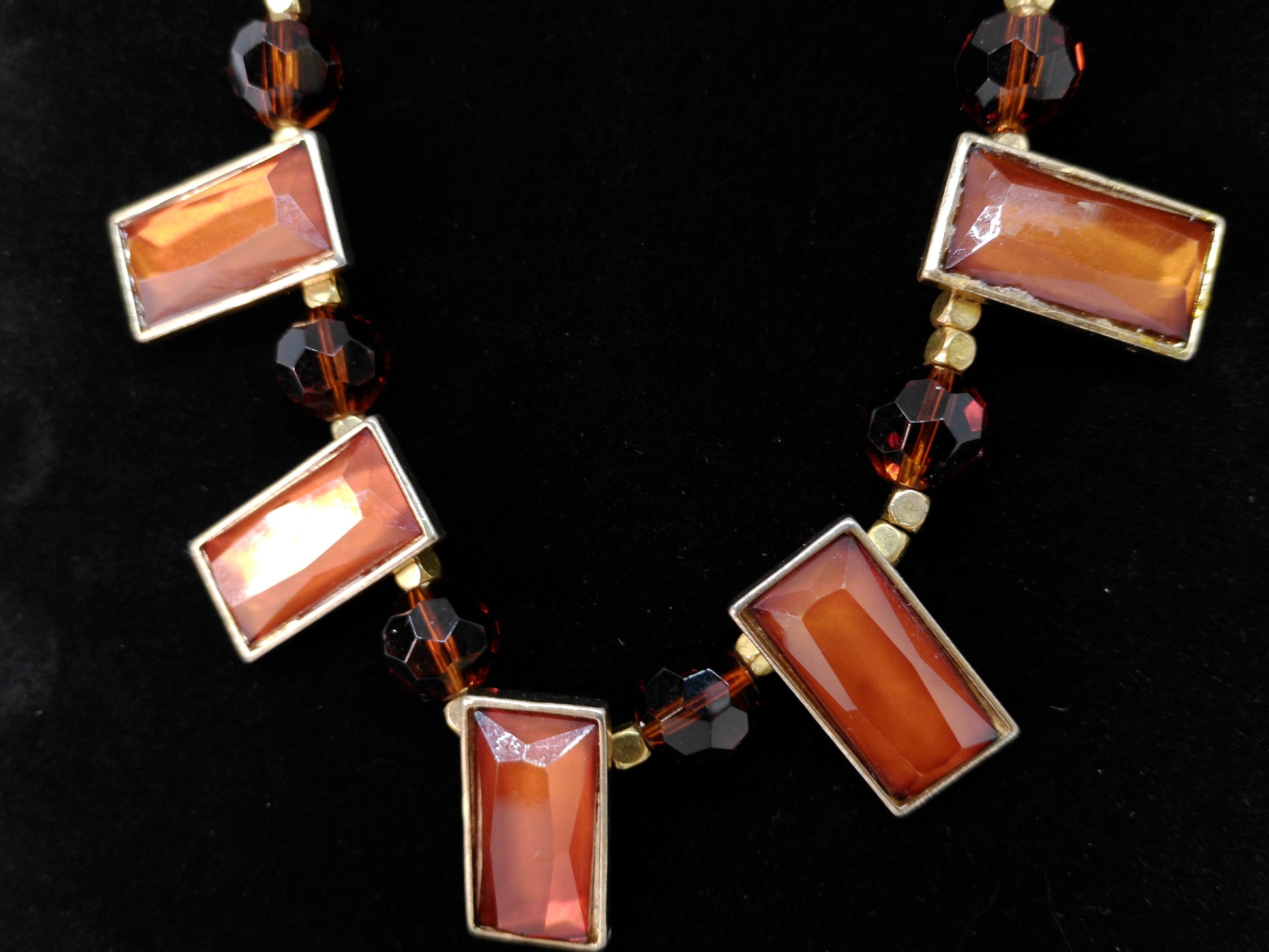 These amber colored faceted glass beads support five (5) beautiful rectangular focal beads with gold-tone spacers. 21-inches.