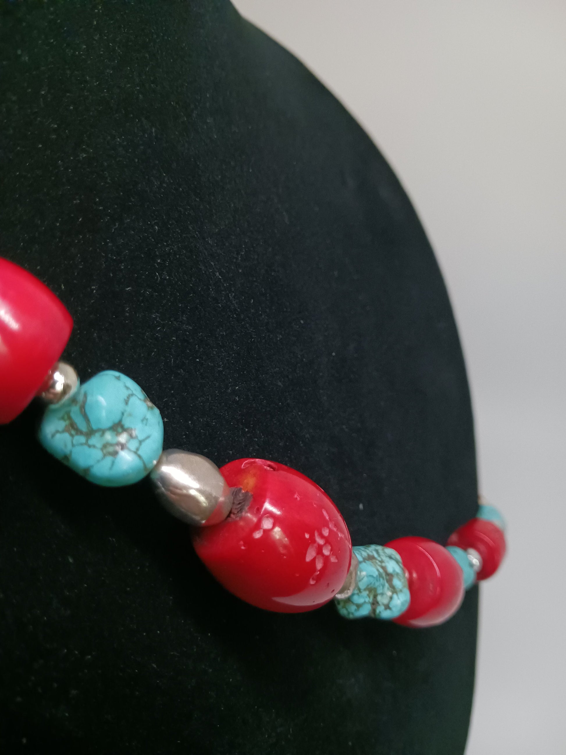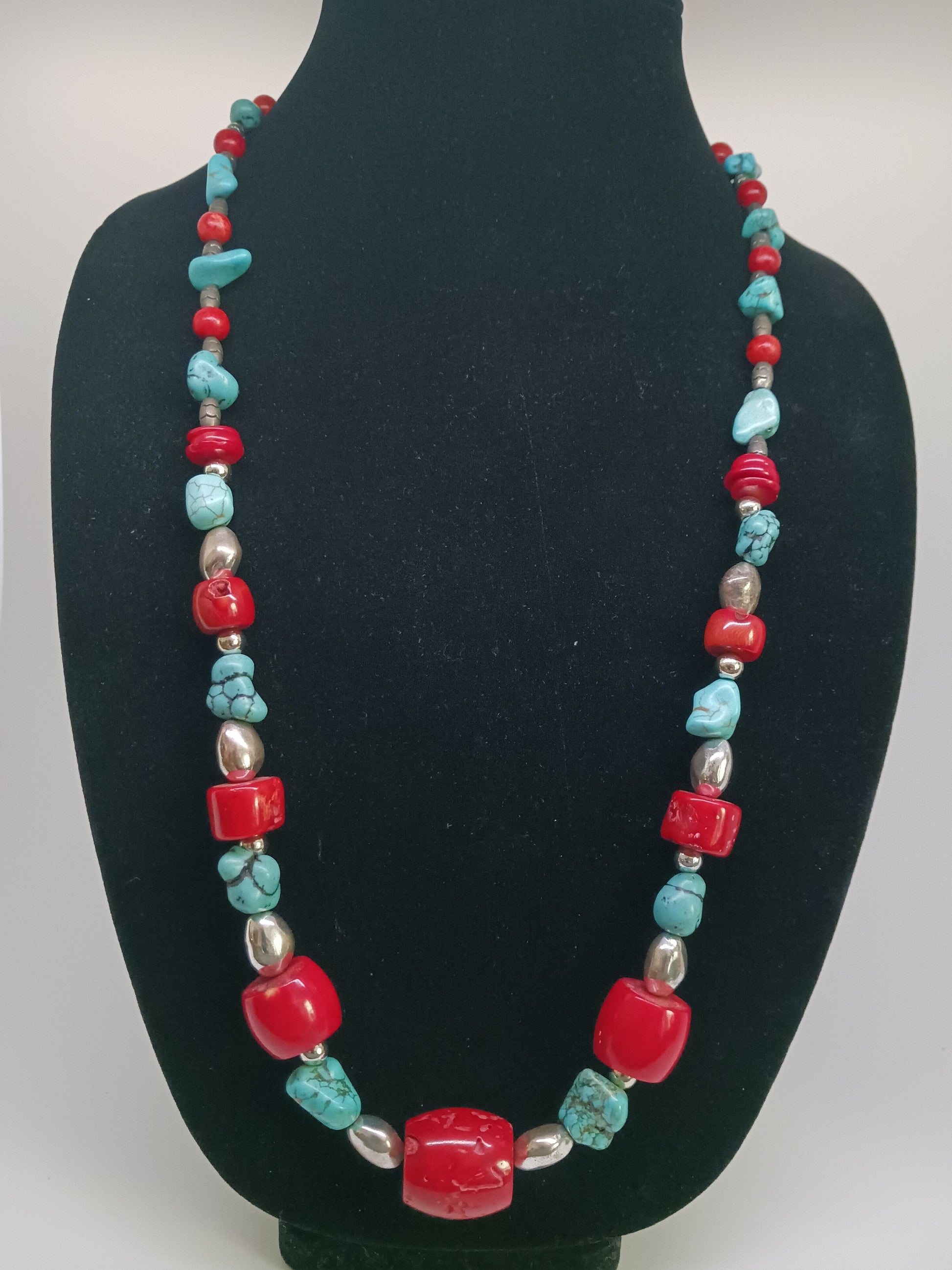 This 18-inch necklace features natural turquoise, natural red coral, and aluminum accents.